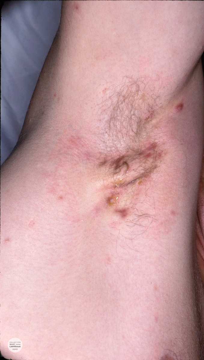 - One of the main etiological theories is that the disease begins with an obstruction of the hair follicles in areas rich in apocrine sweat glands (armpits, groin, buttocks, under the breasts). This obstruction causes the follicles to rupture, causing an inflammatory reaction and the formation of nodules and abscesses.